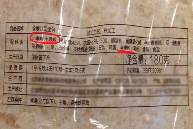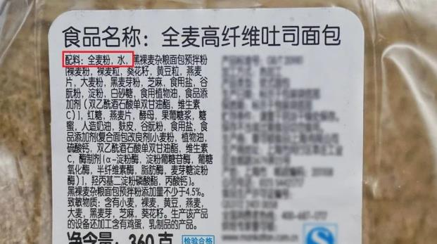 如果在成分表上看到这些名字,它们都是含有反式脂肪酸的氢化植物油:人造奶油、人造黄油、植脂末、植物奶油、植物起酥油、奶精、酥油、玛琪琳........... 04.“全麦面包” 全麦面包是用全麦粉制作而成的,包含了麦子的麸皮、胚芽以及胚乳部分,但市面上卖的所谓全麦面包并不是真正意义上的全麦面包。 虽然看上去表面是黑褐色的,和真正全麦面包没区别,但看配料表就知道了,排第一位的不是全麦粉,而是小麦粉。