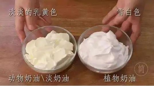 动物奶油主要成分为鲜牛乳,是一种以乳脂肪为基础的奶油。它是从牛奶里提出来,味道很香醇,口感清爽香醇,一点都不腻口,入口会像冰激凌一样自然融化。而且它含有各种微量元素,不含反式脂肪酸,算是一种比较健康的食品。 而植物奶油就是我们常说的人造奶油。主要成分为水、植物油、糖、乳化剂、胶体、香精、色素等,成本比起动物奶油便宜了好几倍。这种人造奶油含有很重的反式脂肪,摄入人体之后很不容易消化,时间长了身体堆积大量的脂肪,还会增加心血管的患病风险!
