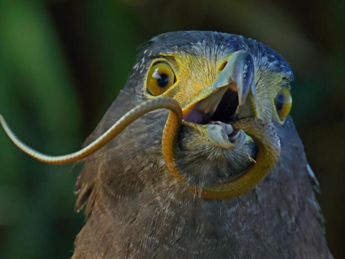 蛇鹫会利用自己腿长的优势,不断的挑衅着面前的蛇类,引起蛇类的反击,并且不断的拍打着翅膀以及来回踱步。蛇类属于变温动物,也就是我们所说的冷血动物,它们有一个缺点就是体力很快会被耗尽。 接下来就是属于蛇鹫的攻击时间,蛇鹫继续利用自己大长腿的优势,不断的用脚掌攻击蛇类的头部,几掌下去就能够将蛇类击晕,严重的可能颈部骨折,当场死亡。之后蛇鹫就会像吃长寿面一样,直接将蛇整条吞下。 蛇鹫的优势就是大长腿以及较高的身体,大长腿不仅是有力的进攻武器,同时腿上还有一层厚实的角质鳞片,能够防御蛇类的咬击。蛇鹫高大的身躯能够给予蛇类压迫感,同时还能够观察蛇类的动向。蛇类在蛇鹫的面前简直毫无反击之力。 蛇雕 要说蛇类的克星,鹰类和雕类绝对要占据其中之一,而在鹰类和雕类当中,蛇雕更是令蛇类头疼的存在,因为蛇雕的主要食物就是以蛇类为主。
