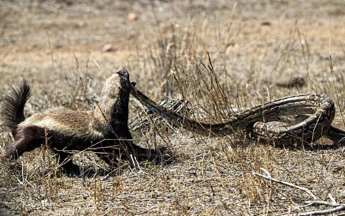 蛇雕对于蛇类有一手,它会先在天空当中翱翔,当发现蛇类时,它会从天空当中立即飞下,从蛇类的后方进行攻击,牢牢抓住蛇类的身体以及头部,然后不断的用锋利的喙啄蛇类的头部,直至蛇类失去防抗能力。 对于体型较小的蛇类则是直接用强大的咬合力咬碎蛇类的头骨,然后直接一口闷。 对于体型较大的蛇类,那么则是一场体力的对抗,蛇雕同样会抓住大型蛇类的身体以及脖颈处,此时大型蛇类会不断地进行挣扎,蛇雕则会将蛇抓上高空,直到蛇类精疲力尽,如果蛇类挣扎剧烈,则直接从高空当中丢下。 蜜獾 “非洲乱不乱平头哥说的算”,对于蜜獾大家应该都不陌生,蜜獾是一种十分有勇气的生物,甚至敢挑衅和进行许多体型比自己大的动物。 在非洲有着许多的蛇类,但是这些蛇类同时也引起了蜜獾的注意。蜜獾皮糙肉厚,而且蜜獾的咬合力也很强大,狮子和斑鬣狗极具韧性的皮毛都容易轻易被它撕开伤口,对付蛇类自然也不在话下。