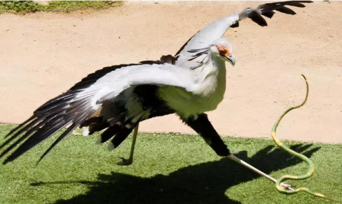 蛇鹫 蛇鹫是一种生活在非洲的鸟类,蛇鹫也拥有飞翔能力,但与大多数的鸟类不同,蛇鹫更喜欢通过行走的方式进行觅食。蛇鹫最喜欢的食物就是蛇类,无论是有毒的蛇类还是无毒的蛇类在蛇鹫的面前都没有抵抗能力。 蛇鹫一旦发现了蛇类,它会兴冲冲地冲向蛇类,接着就是蛇鹫的与蛇共舞环节。