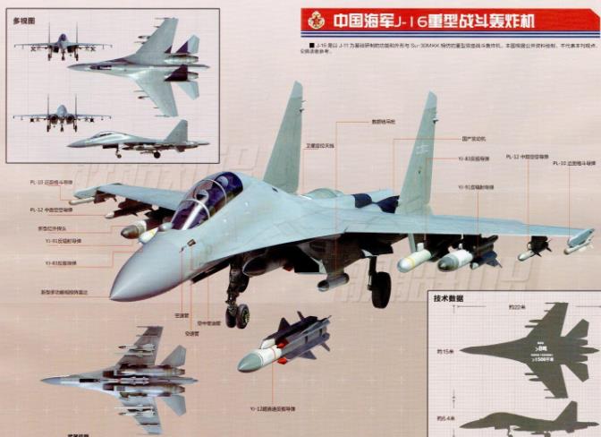 中国研发的鹰击62和83等导弹型号均可以由歼16机携带,歼16机的作战半径高达1500公里,加上导弹的射程其覆盖范围很广泛。而且由于歼16机可以携带空空导弹,所以在面对空中优势的战斗机也不落下风。 歼16机出色的自卫能力使得它具有多用途的实用性,歼16机是标准的西方第四代战机,在我国作战体系中的定位基本上相当于美国改进型F15E。 目前歼16机主要配备给空军使用,加强打击水面舰艇的能力。歼16机有12个武器外挂点最大可达12吨载弹量,既能挂载空地导弹和精确制导弹也能挂载鹰击系列反舰导弹,因而被称为“炸弹卡车”。 此外,它还装备了自动电子扫描有源相控阵雷达,同时配备了先进的电光瞄准系统,使歼16机既具备先进的事态感知系统,还具备了强大多用途的作战能力,有人称其为亚洲第二! 作为我国研制的新一代多用途战斗机,其整体作战性能在我国未来海空军装备上占据了主导地位。歼16多用途战斗机是我国在歼11BS结合引进苏30MKK技术上进行自我研制的多用途战斗机,整体气动性能在借鉴苏30MKK的基础上在机体结构上更新了大量的复合材料,歼16装备了2台涡扇10B发动机,单台最大推力是14.5千牛,最大飞行速度达2.5马赫,最大飞行距离为4000千米,作战半径在1600到1800千米之间。 而且歼16多用途战斗机可挂载12吨弹药,这是我国除苏30MKK以外并不具备的。大载弹量、大航程是歼16最基本的性能,由于歼16安装了与歼20隐身战斗机几近相同的有源相控阵雷达其雷达TR模块数量不少于2千个,对于1平方米截面积的空中飞行战斗机目标来说探测距离不会小于200千米。 又因同时具备综合网络作战能力,因此可以充分利用各个节点的网络信息大大提高了其在战场上的应变能力。