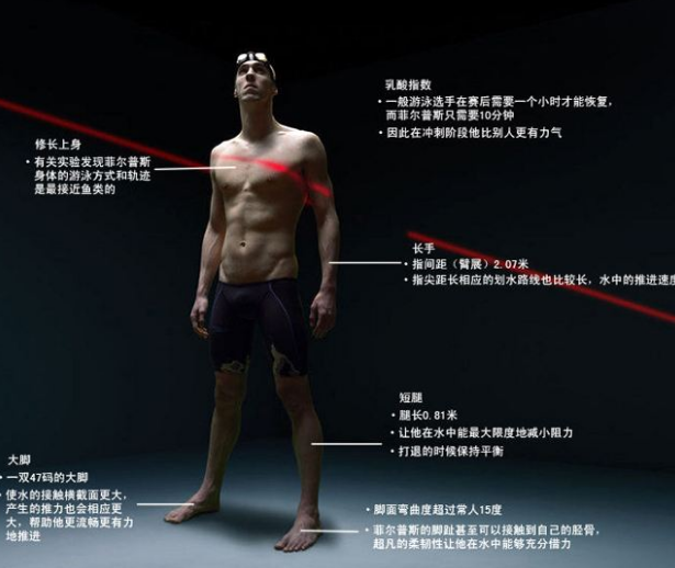 菲尔普斯在泳坛基本就是第一存在,想超越他基本没可能。他巅峰时期就是独孤求败,有他在对手只能是争第二。菲尔普斯统治力能这么强,他的身体是关键,他身上的一切都是为了游泳而生。大手,短腿,大脚等等,这一切都太适合游泳,“菲鱼”确实名不虚传。