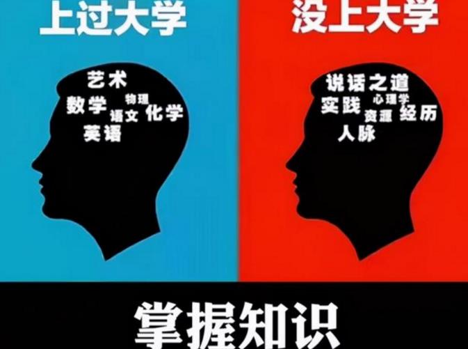 图五:脑中知识面不同,说话办事方式不同 上过大学的人,脑中都是一些学科理论知识,随时随地可以调取出来应用到工作岗位上,所以他们大多数人所从事的工作都是高尖端的,多是脑力工作。 而没上过大学的人,早早进入社会也积累下一定的资源、经验、人脉,但是摸爬滚打多年依旧在社会最底层,想要实现反转还要再受累10年。