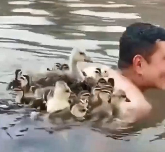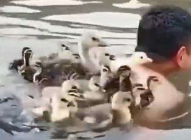 6月10日,德州,一男子在水里游泳时遇到了一群小鸭子。没想到小鸭子们紧跟着他,游到了他的背上,搭起了“顺风船”哈哈哈!网友:小鸭子怕是找到了“爸爸”。