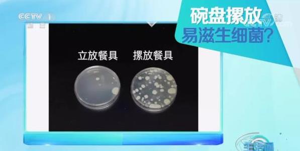 小实验 细菌菌落水平差距如此大 会造成哪些健康风险? ◎短期内急性影响:比如一些致病菌,最常见的致病性的大肠杆菌、沙门氏菌,都可能引起急性胃肠炎,上吐下泻甚至还会脱水、休克,危及生命。 ◎长期影响:长期摄入的霉菌里头可能含黄曲霉毒素这样的一类致癌物,长期接触可能会致癌,甚至有研究表明黄曲霉毒素跟肝癌、胃癌、食道癌都有一定的关系。 因此,厨房的卫生问题一定要引起重视,做好餐具消毒、存放工作,避免细菌滋生。 碗盘如何正确存放? 细菌滋生需要几个必要的条件,营养物质、适宜的温度、水分。 碗筷或者是碗盘不管怎么洗都不可能洗特别干净,这里哪怕残留一点点食物残渣,都可以作为细菌的营养物质。如果摞着放,积了很多的水,房间温度又适宜,细菌就会疯长。 立起来以后水分容易沥干,即使有一点食物残渣也不容易滋生细菌。 有些不良洗碗习惯 不仅不能把碗筷真正洗干净 反而滋生出很多细菌↓↓↓ 01. 用水泡碗,等空闲了再去洗 碗筷泡久了会滋养细菌,有异味。特别是盛粥的碗,如果不立即清洗,风干以后就变得难以清洗。 02. 擦碗布不消毒不更换 用擦碗布擦也是一个健康隐患,擦碗布一定要定期更换、消毒。 03. 洗涤剂直接涂碗上 有的人觉得“洗涤剂直接抹在碗上,去油污效果更强”,但这样不仅更费水,且如果冲洗不干净,人体摄入洗涤剂后会引发腹泻等肠胃不适。 建议将几滴洗洁剂滴到半碗水中,用洗碗布蘸着稀释后的水来刷碗,冲洗后放在另一个漏篮中,最后再用清水冲干净并控干。 04. 餐具不消毒 消毒方法很多,最常用的一种方法就是高温消毒,把它煮沸超过5分钟到10分钟以后,大部分的细菌病毒都能杀死。 条件允许的话可以在家中准备一台消毒机,这是杀死细菌病毒最有效的方法。 值得一提的是,不提倡用消毒剂来消毒,因为不管是含氯的消毒液还是其他的消毒液,难以清水完全冲洗干净,如果有残留物的话,会刺激消化道。