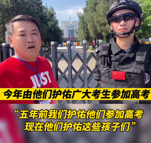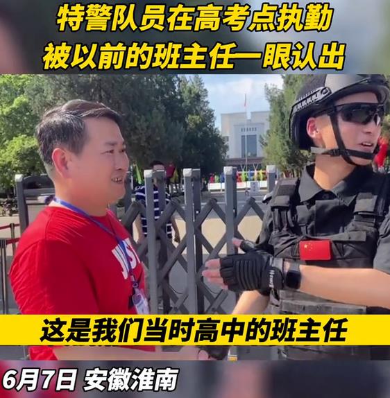 安徽淮南,一名特警队员拉着穿红衣的男子介绍:“这是我们当时高中的班主任。”班主任老师说:“5年前由我们保佑他们参加高考,如今两位已经是光荣的人民警察了,今年由他们保佑广大考生参加高考。”网友表示,为祖国培养了如此优秀的人才,此时,这位班主任一定很骄傲。