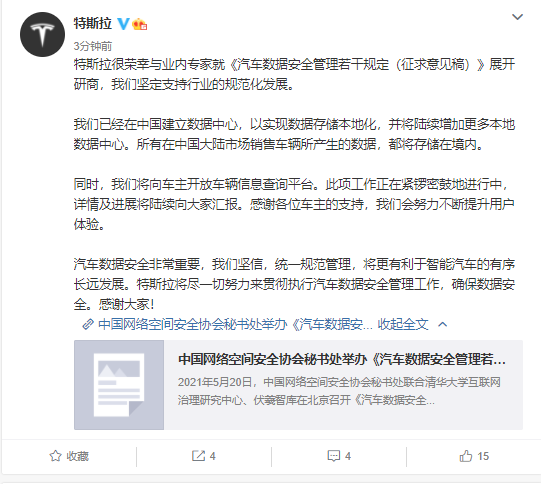 特斯拉官方微博25日发布消息称:已经在中国建立数据中心,以实现数据存储本地化,并将陆续增加更多本地数据中心。所有在中国大陆市场销售车辆所产生的数据,都将存储在境内。 全文: 特斯拉很荣幸与业内专家就《汽车数据安全管理若干规定(征求意见稿)》展开研商,我们坚定支持行业的规范化发展。 我们已经在中国建立数据中心,以实现数据存储本地化,并将陆续增加更多本地数据中心。所有在中国大陆市场销售车辆所产生的数据,都将存储在境内。 同时,我们将向车主开放车辆信息查询平台。此项工作正在紧锣密鼓地进行中,详情及进展将陆续向大家汇报。感谢各位车主的支持,我们会努力不断提升用户体验。 汽车数据安全非常重要,我们坚信,统一规范管理,将更有利于智能汽车的有序长远发展。