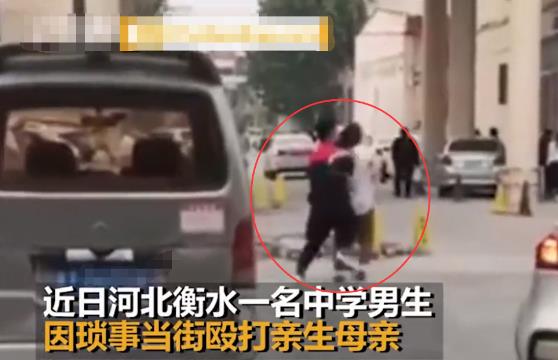 有网友爆料称,在河北衡水的某街区内,一名少年因琐事当街殴打母亲,此事在网上爆出后,引起了广大网友的强烈谴责。 网传视频显示,一位中年女子和一名穿着校服的少年站在路边,母子俩看起来情绪不好,疑似起了争执,随后少年突然对他的妈妈动起了手,由于少年身体强壮,中年女子只能不断地向后躲闪,但依旧被打的十分狼狈。 母亲费力挣开了少年的双手后,急忙向小区内跑去,可少年依旧不依不饶,追上去对母亲实施殴打,在推搡过程中,中年女子多次差点摔倒在地。 少年的这一行为,引起了路人的驻足围观,有路人忍不住劝阻并怒斥了他几句,没想到该少年却怪罪其多管闲事,对着路人破口大骂出言不逊,少年的这一举动引起了所有人的公愤。 一名黑衣男子忍不住出手,当场将少年制服并罚其下跪向母亲认错,男子揪着少年的头发说道:“你敢打你妈?把你养这么大,你怎么孝顺的?混蛋!” 其他的路人也纷纷对男孩进行了训斥,少年大概是害怕再次被打,想要逃跑,愤怒的群众将其拦住并带到了他母亲的面前,少年迫于压力,只好当众给母亲跪下并承认了错误,随后在路人们的劝阻下,少年搀扶着母亲离开了现场。