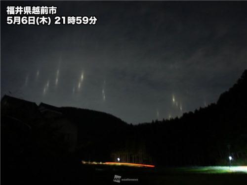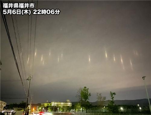 在日本福井县的夜空中,出现了几十枚闪着光的柱子。这些光柱肉眼可见地悬挂在人们头顶之上,让外星人和UFO爱好者迎来了一场狂欢。根据日本气象部门的记录,这些光柱最先在福井县越前市登场,当时正是晚上9点59分。就在人们还忙着呼朋唤友抬头看天时,这波光柱已然开启了一场彻夜大游行。