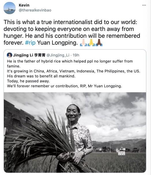 美国网友Kevin转发并评论到:“这才是一位真正有国际视野的人,贡献了自己的一生让全世界人民免于饥饿。他和他的贡献,我们会永远记得。” 来自英国的推动社会主义的积极分子Josh Jackson转发并进一步给英国网友说到:“可能很多人不知道,但他是世界农业史上最重要的人之一,他让水稻增产了30%,他不仅帮助中国人解决了粮食危机,更是帮助了全世界人民。” “反歧视工人组织”转发评论到“致敬。别让任何人说农业是一个没有技术的工种,他就是一位来自工人阶级的天才。”
