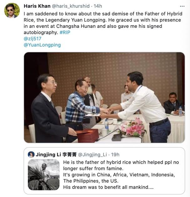 来自巴基斯坦的网友Haris Khan晒出自己曾经在湖南见到袁隆平并和他握手的照片表示悼念。