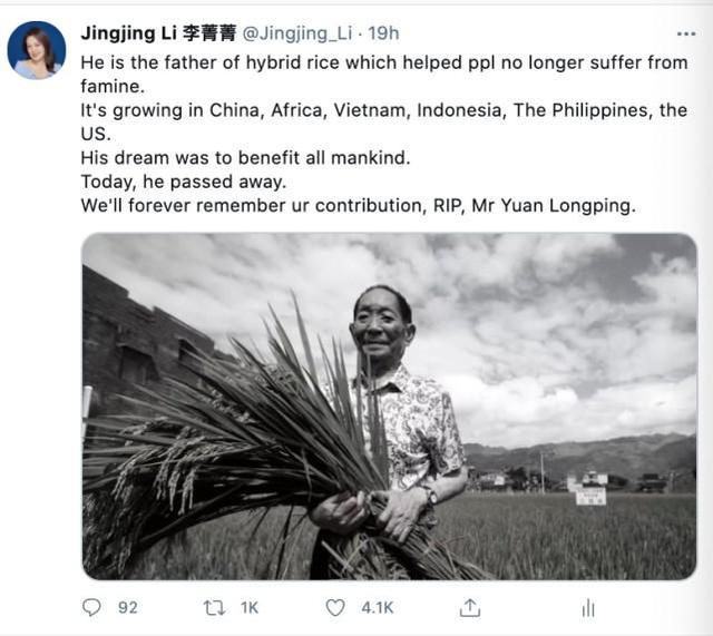 5月22日,袁隆平去世消息公布后,CGTN网红李菁菁在个人海外平台发布了这一消息,配文到:“他是杂交水稻之父,他帮助世界各国人民摆脱饥荒,他的杂交水稻遍布中国、越南、印尼、非洲、美国,他的梦想是造福全世界百姓。今天他离开了我们,我们会永远记住您的贡献。一路走好,袁老。”