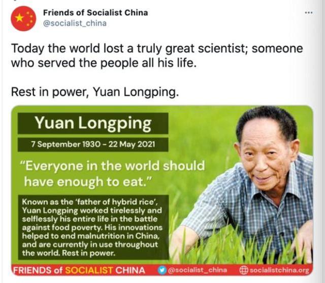 “社会主义中国的朋友”组织也专门制作图片,报道袁隆平生平的伟大成就,并表示深切悼念。