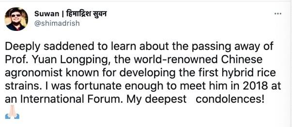 来自印度的网友Suwan留言悼念到:“我曾有幸2018年在论坛中见到过袁老,这位伟大的农学家,今天得知他去世的消息感到无比难过,致以最诚挚的悼念。”