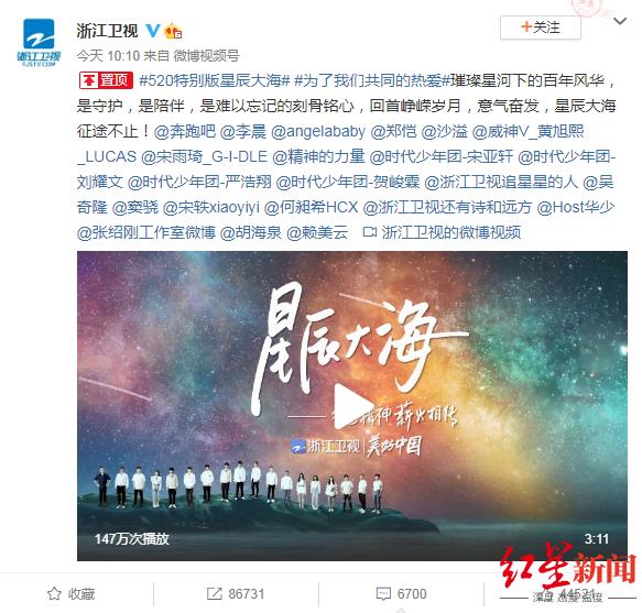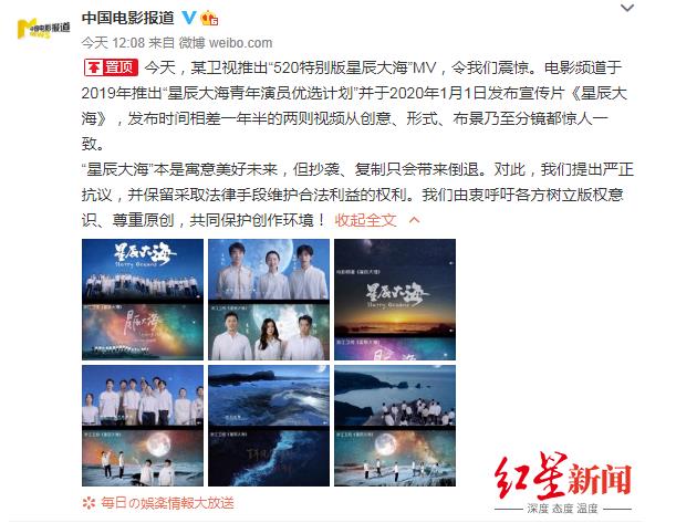 央视电影频道旗舰栏目官方微博@中国电影报道 消息,5月20日,某卫视推出“520特别版星辰大海”MV,令我们震惊。电影频道于2019年推出“星辰大海青年演员优选计划”并于2020年1月1日发布宣传片《星辰大海》,发布时间相差一年半的两则视频从创意、形式、布景乃至分镜都惊人一致。 “星辰大海”本是寓意美好未来,但抄袭、复制只会带来倒退。对此,我们提出严正抗议,并保留采取法律手段维护合法利益的权利。我们由衷呼吁各方树立版权意识、尊重原创,共同保护创作环境!