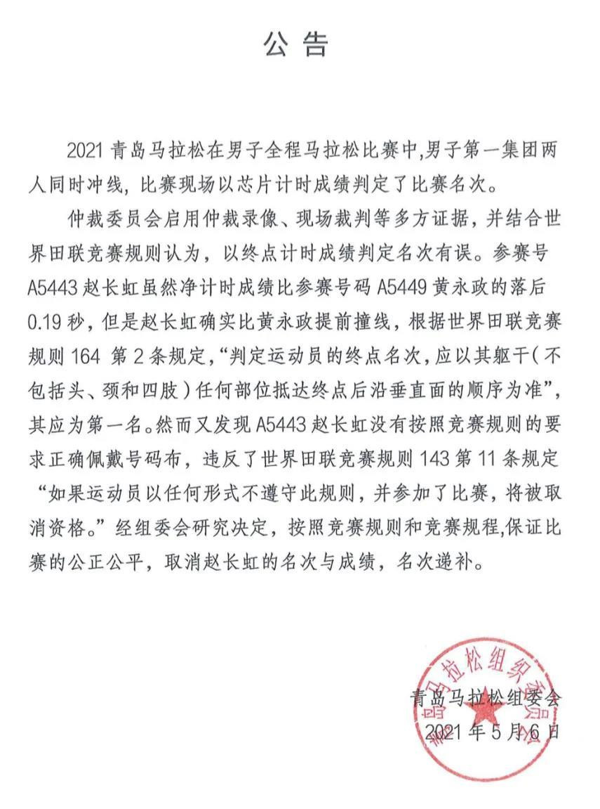 在近期的青岛马拉松比赛当中,男子全马冠军的归属问题被很多网友所猜测和讨论,5月6日下午,青岛马拉松组委会发布公告,对相关情况进行了解释说明,亚军赵长虹的成绩因为佩戴号码布不符合规范被取消了成绩。