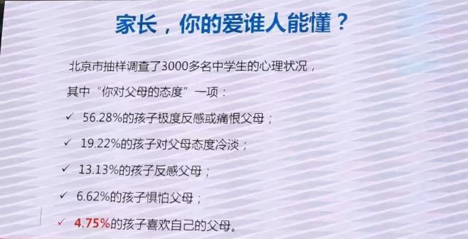 北京市抽样调查了3000多名中学生的心理状况,其中“对待父母的态度”一项中: 56.28%,也就是超过半数的孩子都投给了最强烈的选项:极度反感或痛恨父母。只有4.75%的孩子表示喜欢自己的父母。 这个数字实在是太触目惊心了。许多父母十多年对子女的艰辛养育和殚精竭虑却换来了子女的极度反感和痛恨。这到底是孩子错了,还是父母错了,还是社会大环境存在问题。 现实也许比数字更残酷!曾经听过一句话:如今的家庭教育,只要孩子不跳楼,就可以说是成功的。 2019年4月,因为和妈妈吵架,上海17岁男孩跳高架桥,当场身亡; 2019年2月,因为和父母吵了几句嘴,郑州12岁的女孩跳楼自杀; 2018年9月,因为父母生二胎、学业压力大,广东佛山16岁少年跳楼自杀; 这样的事已经多得有点让人麻木了,这是何等的悲哀! 个人以为,如此残酷的现实或许来源两大原因:一是竞争愈发激烈的应试教育让我们的中学生在特殊的青春期里却面对着极为艰难的学习和生活环境。二是某些家长对青春期教育的无知。 一、我们的中学生在特殊的青春期里却面对着极为艰难的学习和生活环境 从教近二十年以来,我常常听到这样的感慨:只要不谈学习,几乎个个都是好孩子!个人以为,青春期是人一生中,最需要得到心理呵护,心理认同的时代。然而,悲哀的是应试教育的沉重大山将青春期的中学生最需要的心理呵护和心理认同阻隔在春风不到玉门关的“苦寒塞北”。 何为青春期?青春期就是身心发展极为不平衡的青年早期。身体迅速发育,但心智发育却不成熟——这主要表现在他们自以为长大了,是成人了,但实际上在对世界、对自我的认知上与成人相比是幼稚的。另外,跟成人相比,他们控制自己情绪的能力也是相对较弱的。可以这样说,正是这样的身心发展不平衡,决定了青春期是人一生中最需要心理呵护和心理认同的岁月。 不幸的是我们的青春期孩子们遭遇了比成人还要艰难的学习和生活环境。初中生普遍睡眠不足8小时,初三学生睡眠不足7小时,高中生睡眠不足7小时,高三学生睡眠甚至不足6小时。其余的时间,除了上洗手间、吃饭和少的可怜的午休、少的可怜的课间,我们的中学生们都在为中高考而艰苦的鏖战。 从教近20年的我认为,如今中学生的学习强度,尤其是初三高三,就算是心智相当成熟,身体非常健康的成人也是难以忍受的,更不必说,心理极为脆弱的青春期中学生。 青春期的逆反是正常的心理,但是56.28%的中学生极度反感或痛恨自己的亲生父母,我想,最主要的原因恐怕是青春期中学生所面对的学习和生活出了较大,甚至很大的问题。 如果不是愈来愈激烈的中高考竞争,我甚至可以断言,极度反感或痛恨父母的中学生比率会大幅下滑。是愈来愈激烈的中高考竞争,是这样的生活和学习阻隔了来自老师和父母应有的青春期关怀:心理呵护和心理认同。 二、某些家长对青春期教育的无知 我不想长篇大论,只想谈谈一些家长对青春期教育无知的现象。 1.这孩子火气怎么这么大,怎么如此冲动?如此没有教养?我不教训他(她),将来社会会教训他(她)的。于是战争开始了…… 青春期的孩子由于身心发展不成熟,控制情绪的能力是明显低于成人的。火气大,冲动本来就是青春期的人格特质。我们应该淡定,应该坦然接受。想想自己十二三岁的时候,是不是也容易冲动,发脾气?这个时候我们要做的不是教训他(她),而是等孩子气消了,跟孩子好好谈谈,像对待朋友那样的谈谈,如此,孩子的心智才会发展得更顺利,控制情绪的能力才会渐渐提高。孩子的教养才会渐渐养成。 2.孩子不是自己生命的延续,不是自己梦想和希望的载体,他们是独立的生命。 青春期的亲子冲突不少源于父母将自己没有实现的希望、梦想强加到孩子身上,于是战争开始了。 我们要记住,孩子是我们的,但又不是我们的,他们是独立的生命,他们拥有独立的人生,他们的人生之路终归要自己走。发火时心里默念一句“孩子的路还是要他自己走,成长注定的坑早晚都逃不掉”,把自己和孩子分离开,别给气头上的孩子火上浇油。 3.青春期的孩子因为心智不成熟,往往过于在乎他人的评价。因此,父母不要当着外人的面批评孩子。 人活一张脸,是人都要面子。心智不成熟的青春期孩子往往过于在乎“面子”!为人父母和老师者不可轻易当着众人的面批评孩子。 个人的经验是,如果当着全班的面批判某个学生,后果往往是引起这个学生的极度反感。相反,私下的将批评含在谈话中的交流往往会赢得学生的好感,同时也会有更好的教育效果。 4.对青春期的孩子喋喋不休,啰里啰嗦。 青春期的孩子克制情绪的能力普遍较弱,喋喋不休的啰嗦往往引爆他们的情绪。说一遍,就够了,我们亲爱的家长和老师们! 其实应该还有不少青春期教育的无知,暂且谈到这里。 一言蔽之,要改善青春期的亲子关系,一则家长要学习青春期教育,这是一门学问。二则,希望我们的中学生的学习生活环境能有所改善。