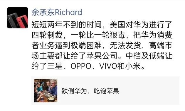 余承东:制裁让华为手机无法发货,高端让给了苹果 中低端让给了OPPO、vivo和小米。4月30日午间消息,华为消费者业务CEO余承东在朋友圈谈及智能手机市场份额的变化时表示:“短短两年不到的时间,美国对华为进行了四轮制裁,一轮比一轮狠毒,把华为消费者业务逼到极端困难,无法发货。华为手机和平板的国内高端市场主要让给了苹果,中档及低端让给了OPPO、vivo和小米。