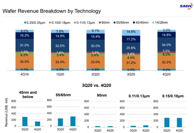 这里要注意,国内的产能稀缺并不是仅仅16/14nm,7nm,5nm。以中芯国际的28nm/14nm合计营收占比为例,2019年Q4--2020年Q4五个季度分别为6.0%, 7.8%,9.1%, 14.6%,5.0%. 其中第四季度显然有较大的下降,原因是因为华为被禁失去了一个大客户。