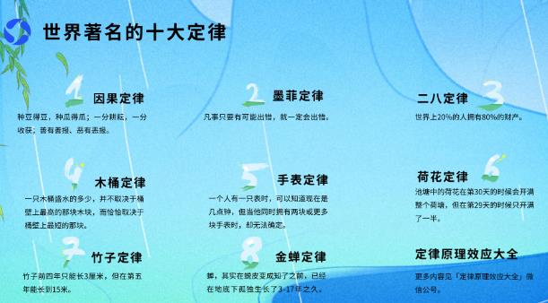 1、因果定律 有因才有果,有果必有因。任何事情的发生,都有其必然的原因。这就是“因果定律”。 因果定律,或许是少有的因为太稀松平常,所以非常容易被人忽略的一个定律,但往往会在事件发生、发展的过程中逐渐凸显出来。 正像民间广为流传的俗语:种豆得豆,种瓜得瓜;一分耕耘,一分收获;善有善报、恶有恶报等,因果定律可以解释世间万事万物,它已经融入到每一个人的血液,并将跟随每个人的一生。 2、墨菲定律 只要提到世界著名定律,墨菲定律必定上榜,其是在任何人的身上可被验证的一个定律,简单概括为一句话即是: Anything that can go wrong will go wrong. 凡事只要有可能出错,那就一定会出错。 3、二八定律 你肯定听过这样一句话:世界上20%的人掌握了80%的财产。很气人是不是,更气人的是这个差距还在进一步拉大。 不过二八定律可不体现在这一个方面,“二八定律”认为:原因和结果、投入和产出、努力和报酬之间本来存在着无法解释的不平衡,若以数学方式测量这个不平衡,得到的基准线是一个80/20关系。 举一个简答的例子:有些人的好成绩在于天赋,有些人的好成绩在于努力,这就是为什么你花费80%的努力,而别人只需花费20%就能轻而易举取得的原因。所以,选择大于努力,勤也能补拙。 再举一个简单的例子:你属于20%的精英阶层,还是属于80%的普通人呢? 4、木桶定律 一只木桶盛水的多少,并不取决于桶壁上最高的那块木块,而恰恰取决于桶壁上最短的那块。 这是“木桶定律”最广为人知的表述,不过现在也有了延伸: 1)木桶的储水量,还取决于木桶的直径大小,直径大>直径小; 2)木桶的储水量,还取决于木桶的使用状态,如果有缝隙,则会漏水; 3)木桶的储水量,还取决于各长短木板之间的配合程度,若密切配合,缝隙小,则储水多; 4)木桶的储水量,还取决于各块木板的厚度,若厚度不够,则容易碎裂; 5)木桶的储水量,还取决于木桶底面的面积,若底面小,则盛水空间就小; 6)木桶的储水量,还取决于木桶的形状,若每块木板长度相同,周长相同,则圆形>方形。 5、手表定律 一个人有一只表时,可以知道现在是几点钟,但当他同时拥有两块或更多块手表时,却无法确定。拥有两块以上的手表并不能帮人更准确的判断时间,反而会制造混乱,让看表的人失去对时间的正确判断。 手表定律的本质就在于选择太多,如果仅有一种选择,那么人在面对问题、解决问题的时候就会坚定很多。所以,选择太多也未必是一件好事。 三个必知的成功学定律: 荷花定律、竹子定律、金蝉定律是三个著名的成功学的定律,告诉我们“要想成功,就需要忍耐和坚持。”而这个时间长短则因人而异、因事而异,有的需要30天、有的需要三五年、有的甚至需要17年之久。 6、荷花定律 在一个荷花池中,第1天开放的荷花只是很少的一部分,第2天开放的数量是第1天的两倍,之后的每一天,荷花都会以前一天两倍的数量开放...... 假设到第30天荷花就开满了整个池塘,那么请问:在第几天池塘中的荷花开了一半? 是第15天吗?错!!!是第29天。 这就是著名的“荷花定律”,也叫30天定律。 7、竹子定律 竹子用了四年时间,只是仅仅长了3厘米。从第五年开始,每天以30厘米的速度快速生长,只是仅用了六周时间,就能长到15米。其实在前四年里,竹子的根已经在土壤里延伸了数百平米。这就是著名的“竹子定律”。 8、金蝉定律 蝉,在它蜕皮变成知了之前,在地底下靠刺吸植物根部汁液维持生命,在忍受了黑暗、冰冷、孤独,且长达3年甚至17年之久后,幼虫成熟,终于在某个夜晚钻出地面、爬到树梢、完成蜕变,同时静静地等待太阳升起那一刻的来临,它便可以成功地振翅飞向天空,冲向自由。这就是著名的“金蝉定律”。 9、帕金森定律 企业在发展过程中,其行政机构会像金字塔一样不断增多,行政人员不断膨胀,每个人都很忙,但组织效率越来越低下。这种现象被称为“帕金森定律”,也叫“官场病”、“组织麻痹病”。 在大的企业中,一个萝卜一个坑,他们每天都很忙,但是他们具体在忙什么,可能连他们自己都不知道。根据二八定律,这些人80%的忙碌对于推动工作进展的作用微乎其微。 10、波什定律 表扬愈具体,愈能达到鼓励的目的。 这就是“波什定律”,由法国学者罗瑟琳·波什提出,意指人如果知道了自己什么地方做得很好,就会去努力把这方面做得最好。 在我们身边,大多数人的天赋和闪光点是没有被挖掘和看到的,所以一生碌碌无为。但是,人如果知道了或者被别人发现了自己什么地方做得很好,就会去努力把这方面做得最好,就能取得很好的成绩。