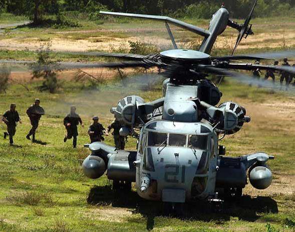 CH-53“海上种马”:是美国西科斯基公司研制的军民两用运输直升机,于1966年服役,载重量16吨,最大起飞重量38.4吨,可载员37人,共发展了CH-53E“超级种马”、CH-53K“种马王”三款型号,它是目前美军现役最大的运输直升机。