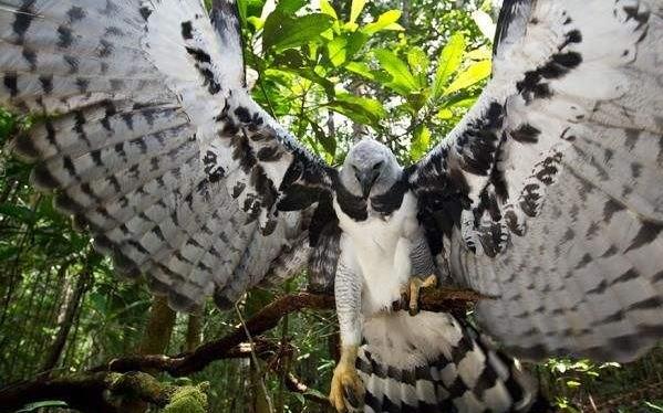 在鸟类中,我们把性情凶猛,具有攻击性的掠食性鸟类统称为猛禽,它们个个都翼大爪利,一般都能够捕杀一些体型比自己还大的物种,是处于食物链顶端的生物。 比如我们耳熟能详的金雕、矛隼、食猿鹰、蛇雕等等,但如果非要在这些猛禽中一较高下的话,它们之中的大佬我认为毫无疑问是被国家地理频道称为“空中最伟大掠食者”的美洲神雕——角雕。 角雕也叫哈比鹰,它拥有猛禽中前三的强壮体格,首先在力量和体型上就要碾压许多对手了。在它们长达110厘米的身高下,翼展基本都维持在2米以上,最多可达2.3米左右的长度,是毫无争议的大型猛禽。 当然,角雕的体格并不能使它称霸一方。不过即使在自身体重大多不足12公斤的情况下,它们也能轻易捕杀比自己还大的猎物,而且往往是一击制胜!丝毫不拖泥带水,一招即毙命。这一切都源于它独一无二、锋利无比的利爪。 角雕的爪子足足能够达到12厘米之长,是所有猛禽中最长且最尖锐的爪子,这双利爪可以说是最完美的攻击武器。即使出了猛禽界,在整个动物界中都是数一数二的,甚至连狮虎这类猛兽的爪子在角雕的利爪面前都要显得逊色三分,简直是“空中飞熊”。 角雕的双爪在捕抓猎物时,能够产生上百斤的力量,双爪的握力足足达到了179公斤(358斤)之大。凭借这看起来使人背脊发凉、比沙包还大的利爪和顶级的战斗技巧,角雕一次次地轻易捕杀一些大型猎物,如猴子、浣熊、树獭、水豚和鹿,甚至是豪猪都是它的“爪下亡魂”。 不仅如此,在体格和利器都名列前茅的情况下,角雕还拥有一种许多猛禽都不会的顶级战斗技巧——它掌握了在丛林中高速捕猎的“战斗艺术”。 众所周知,一般猛禽在树木繁茂的丛林中并不好发挥自身的实力,因为翅膀容易被树枝干扰,从而影响自身的速度和招式。但是这些对于角雕来说却根本不算个事。 它能在森林中自由穿梭,轻巧突袭,以时速50-80公里每小时的速度出击,随后用自身宛如利刃的爪子,一下击穿猎物的头骨或者是脊柱,从而将猎物一击毙命。所以,即使是猴子这类灵活的灵长类动物也是它们食谱中的常客。 也正是因为这种独特的捕猎方式,才让它有了“空中美洲豹”的美誉。 正是凭借着这些强大的硬实力。角雕才能在这个仅鸟类就分布多达4000多种,占据了世界鸟类5分之2的地方——凶险的亚马逊雨林中脱颖而出,成为了最顶端的掠食者。甚至获得了“最伟大的鸟中掠食者”和“最完美的空中杀手”等称号。除了人类,它们可以说是没有天敌的存在。