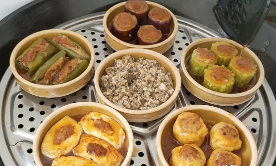 今天跟大家分享怎样一锅做出几个菜来,而且都是客家人百吃不腻的菜品,小份量多样式,营养丰富而且做法还简单,省时又实惠,家人们也特别爱吃。 食材准备:盐水豆腐2小块,油豆腐6个,苦瓜1根,茄子1个,辣椒2个,梅头肉1块,梅菜干1小把,4个红葱头,6朵干香菇,马鲛咸鱼,胡椒粉,蚝油,生抽,盐,淀粉,花生油等。 详细做法步骤如下: 第一步:食材的量大家看着准备,我这里准备的量是做两锅的,先,把苦瓜茄子辣椒清洗干净,洗净之后把它们的头部尾部切掉,然后切小段,用个小勺子把苦瓜囊挖掉不要,茄子用根筷子给它转出一个洞洞来,挖好后放一边备用。 第二步:准备一块三肥七瘦的梅头肉,洗净后把它切成小块,切好后把它放到绞肉机中绞成肉泥,肉泥打好后用勺子给它装出一半来,剩余的肉泥留在绞肉机中,加入4个红葱头,几朵泡发洗净的干香菇,然后再加上点胡椒粉,少许的蚝油,一丢丢的生抽,少量的盐,一小勺淀粉,继续开动绞肉机,把它绞碎搅拌均匀。 第三步:肉馅调好,我们现在来酿苦瓜、辣椒和豆腐,把调好味的肉馅,用筷子挑起来往苦瓜辣椒豆腐里塞就可以了,酿好后先放一边备用。 第四步:接下来我们切一点梅菜干碎,梅菜干比较咸一定要多给它泡洗几遍,切好的梅菜干放到碗中,加入一大勺留出来的肉馅,再调上少许的胡椒粉,少许的生粉,一点点的盐,盐不用太多,因为梅菜干是咸的,最后加点花生油,先给它搅拌均匀,搅拌均匀后直接放入钵子中铺平备用。 第五步:剩下的肉馅我们是用来酿茄子的,加上点马鲛咸鱼碎,同样加少许的胡椒粉,一点点蚝油,少许的生抽,一小勺生粉,用筷子给它搅拌均匀,这一点肉馅我们就不用下盐了,因为马鲛咸鱼是很咸的,而且马鲛咸鱼和茄子的味道是最搭,肉馅调好把它塞到茄子中就可以了。 第六步:准备一个煎锅,锅中下少许的油,我们把酿好的菜给煎一下,肉朝下,中小火给它慢慢煎,煎至有肉的那面微黄就差不多了,苦瓜茄子还有白豆腐可以给它翻面煎一下。 第七步:煎好的酿菜分别给它们装进钵子中,这6个菜都是我们客家人经常吃的家常菜,也是我们这边有名的客家菜,逢年过节时,都会做来待客的哦。 第八步:准备一个大一点的锅,锅中烧开水,放一个蒸架,然后把我们准备好的6个菜放进去,把锅盖盖上调大火,蒸12分钟。 第九步:这个时间我们来调碗料汁,准备一碗清水,加入蚝油,生抽,一大勺的淀粉,把它给搅拌均匀,等我们的菜蒸得差不多时,就把调好的酱汁煮一下,把它煮至浓稠后,再加上一点油,搅拌一下就可以关火了。 第十步:6个菜蒸好了,把煮好的料汁淋到酿好的菜品中,梅菜肉饼就不用浇汁了,这6道客家有名的家常菜就做好了,一锅熟口味多,咸香清淡苦辣味应有尽有,营养丰富口味佳,喜欢客家菜的朋友赶紧来试试吧。