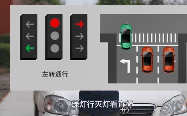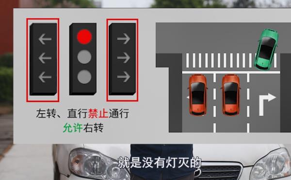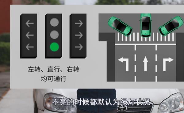 由于灯亮的时候,我们只要看红绿灯就可以了,红灯停绿灯行这个很简单,所以喵哥重点讲一下灯不亮的时候,在这一版新国标红绿灯里面,灯不亮的时候主要是指左转和右转的红绿灯不亮,这个时候绝大多数情况下都默认为绿灯状况,可以直接通行。