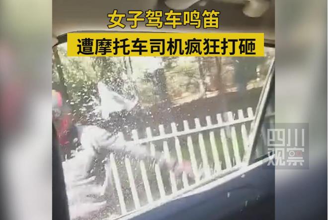 市民李女士出行途中鸣笛,一男性摩托车驾驶员误以为向他鸣笛,超车拦住李女士车辆,随后疯狂砸车窗,掰后视镜,车窗玻璃都被砸破,全程持续1分钟。