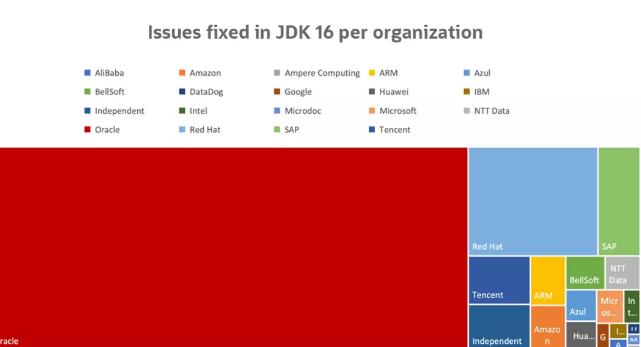 3 月 16 日,甲骨文正式发布 Java 16。甲骨文表示,现在为所有开发人员和企业提供 Java 16。据悉,按照甲骨文重要补丁更新(CPU)时间表,甲骨文 JDK 16 将至少获得两次季度更新。随后,甲骨文 JDK 17 面世。虽然 Java 17 将于 2021 年 9 月正式发布,但是 jdk.java.net 已经提供了它早期的访问版本。在转向六个月的发布周期后,Java 16 是甲骨文发布的第七个特性版本。甲骨文称,“在六个月的发布周期下,可用于生产的创新交付速度已大大提高”。Java 16 累计修复了 1897 个问题,其中,有 1397 个由甲骨文工作人员完成,还有 500 个由个人开发人员和其他组织机构的开发人员贡献,包括 ARM、SAP、RedHat 和腾讯以及微软、英特尔、华为等。而一些小型组织也贡献了 Java 16 中 3%的修复,比如 Ampere Computing、Bellsoft、DataDog、Microdoc 和独立开发人员。