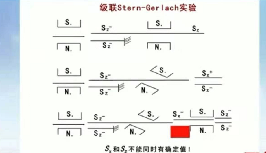 也就是说,银原子具有自旋,它的自旋可以取两个值,它们大小相等,方向相反。 我们进一步把银原子拆开,进入银原子的内部,你会发现银原子的核外具有47个电子。其中,46个电子都在内层满满的排好了,最外层只有1个电子,银原子的自旋就是由这最外层的1个电子带来的。 这也是我们选择银原子做实验的原因。因为它的最外层只有一个电子,角动量的取值只有两个,这样问题就比较简单。如果我们选择其他元素,核外有三四个电子,那它们经过不均匀磁场的时候,还不知道要分裂成多少束呢。 这样,我们就能完全理解斯特恩-盖拉赫实验了。 3 问:为什么银原子经过磁场会分裂成两束? 答:因为银原子最外层有一个电子,电子的自旋可以取大小相等,方向相反的两个值(±1/2)。所以,银原子整体就表现出具有大小相等,方向相反的两个自旋角动量,这样它们经过不均匀磁场的时候,自然就会分裂成上下相等的两束。 斯特恩-盖拉赫实验弄清楚了,好戏才刚刚开始,因为更精彩的是级联斯特恩盖拉赫实验。 级联斯特恩-盖拉赫实验,顾名思义,就像三级火箭那样,一级连着一级,所以叫级联。具体到实验里就是,我们让一束银原子经过一个不均匀磁场,银原子分裂成了两束。 然后我们把其中的一束挡住,让另外一束再次通过一个不均匀磁场(磁场的方向可以与原来的不同)。当然,你要高兴,还可以到后面再级联一次。