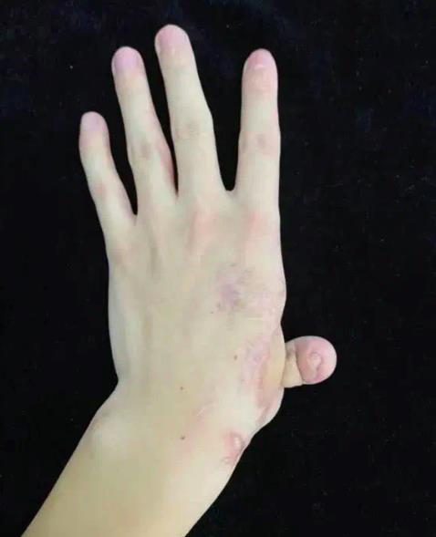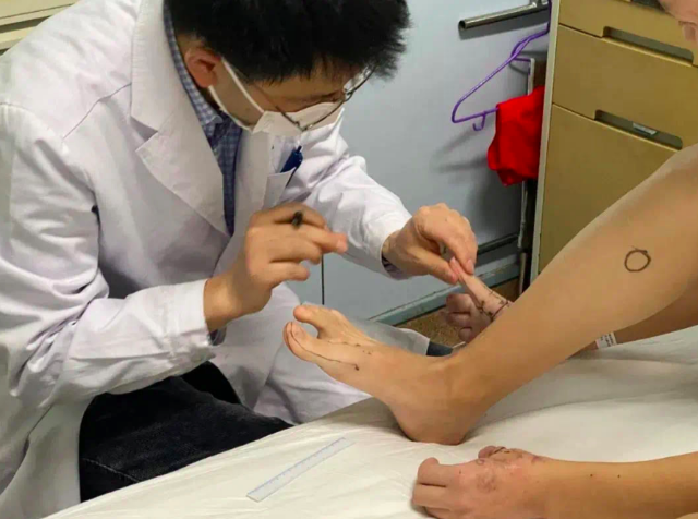 为了保住左手功能,患者慕名来到积水潭医院手外科就诊。陈山林检查后发现,他的左手第一系列缺失,若采用传统办法进行拇指再造,不仅重建的掌骨有被吸收掉的风险,而且患者无法获得有功能的腕掌关节。稳定又可活动的腕掌关节恰恰在发挥拇指功能中是最为重要的一环。考虑患者左手仍保留完整的大多角骨,陈山林团队决定为患者定制化制作金属3D打印的第一掌骨,满足患者第一腕掌关节的解剖学重建,为患者的拇指再造提供了一个良好的骨性基础。经文献检索,该技术属于世界首创。 掌骨重建对于患者的拇指再造仅仅是攻克了第一道难关。由于患者拇指反复多次手术,术区皮肤缺损,瘢痕严重,在解决了骨性问题后,下一步的难点则是继续设计皮瓣,解决其皮肤覆盖的难题。对于再造拇指,除了需要重建拇指指甲,还需要较大面积的足背游离皮瓣进行掌骨处的皮肤覆盖。同时,团队采用共蒂的第二足趾趾骨游离移植,重建拇指指骨部分。而足部的供区则采用游离腹股沟皮瓣及髂骨进行覆盖。这样不仅可以保留5个脚趾,而且避免了传统植皮手术给患者带来的不适,同时使供区更加美观。