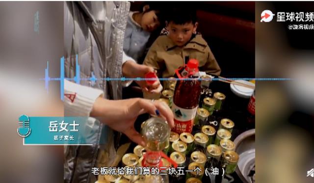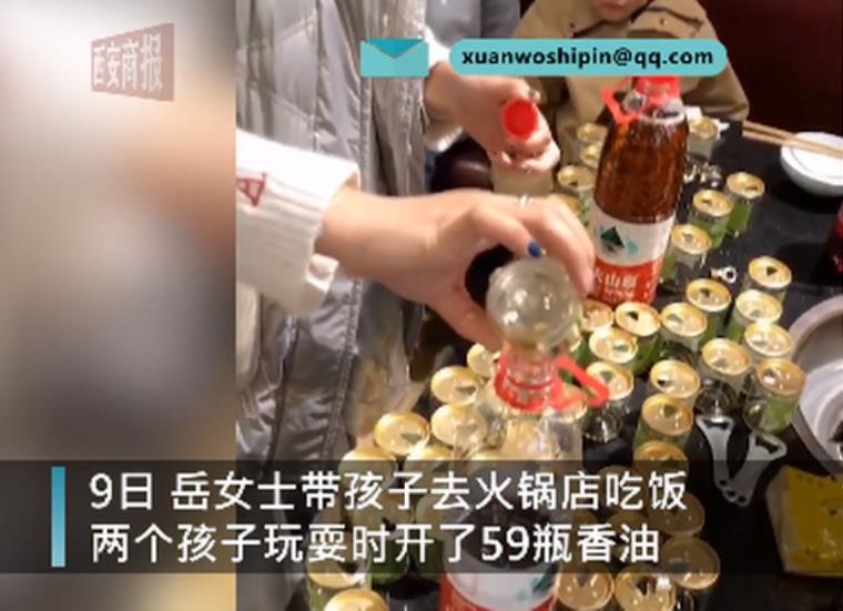 四川遂宁。9日,岳女士带孩子去火锅店吃饭,两个孩子玩游戏开了59瓶香油。10日,岳女士表示,当时火锅店人比较少,大人没注意看,孩子无聊就玩游戏,开了59瓶香油,岳女士称,最终,用两个矿泉水瓶子将香油装好带回家。