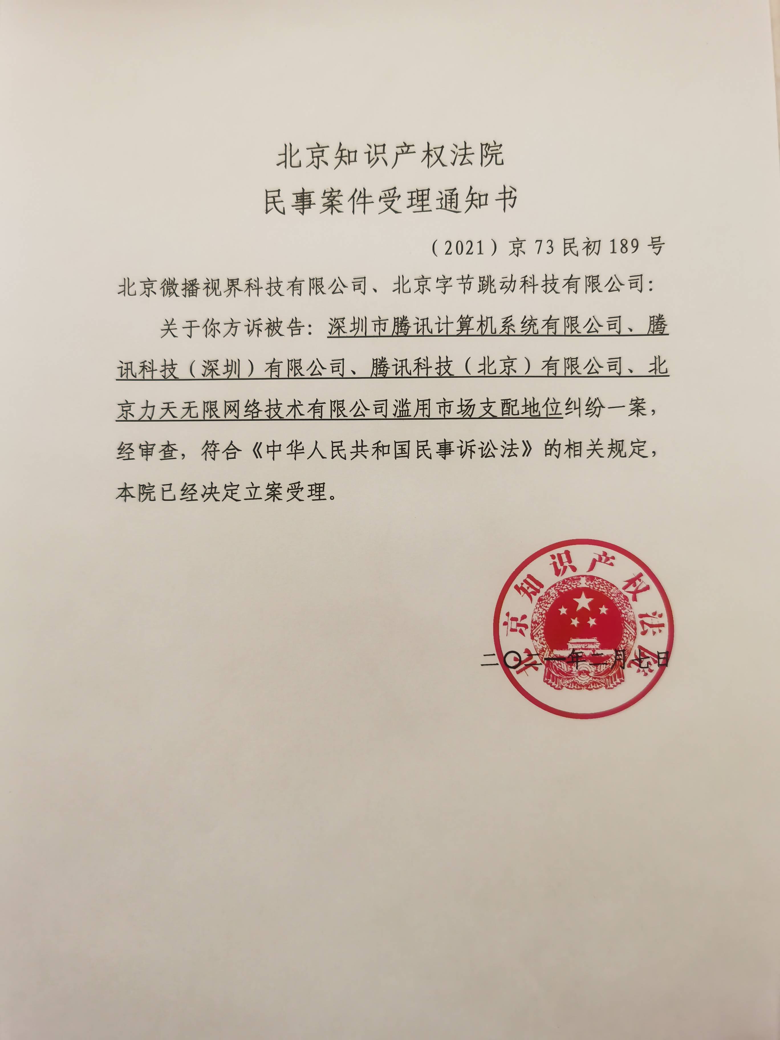 2021年2月7日,北京知识产权法院正式受理抖音诉腾讯垄断纠纷案。该案是自2020年底《关于平台经济领域的反垄断指南(征求意见稿)》公布以来,国内首例发生在互联网平台之间的反垄断诉讼。 据了解,2018年4月起,腾讯旗下微信以“互联网短视频整治”为由,封禁了抖音、火山、快手等30余款短视频App的分享链接。但2018年8月后,腾讯推出的微视及腾讯参与投资的快手等App都被陆续解封,可以在微信内正常分享和播放,但抖音、火山等字节跳动旗下App仍处于封禁状态。同期,腾讯先后推出了十几款短视频产品,引发了业内对于腾讯打压字节跳动的猜测。 2021年2月2日,在遭遇腾讯封禁三年后,抖音向法院正式提交诉状,起诉腾讯垄断,要求解封。腾讯回应称:字节跳动系“恶意构陷”,认为字节跳动及相关公司还存在诸多侵害平台生态和用户权益的违法违规行为,腾讯将继续提起诉讼。 当晚,抖音针对腾讯的声明表示,腾讯所谓“违规获取微信用户个人信息”并不属实。微信、QQ不仅有完备齐全的用户好友关系,而且已经深入用户生活的各个领域,属于具有“市场支配地位”的基础设施,与此同时,腾讯长时间封禁抖音,涉及数亿用户。抖音认为,用户对自己的数据具有绝对的、可完全控制的权利,应该远远高于平台的权利,不应该成为腾讯公司的“私产”。 中国政法大学知识产权研究中心特约研究员、北京云嘉律师事务所律师赵占领接受采访时表示,在中央经济工作会议将反垄断及反不正当竞争作为今年八大重点经济工作任务之一的背景下,该案对于整个互联网行业将产生极大影响。