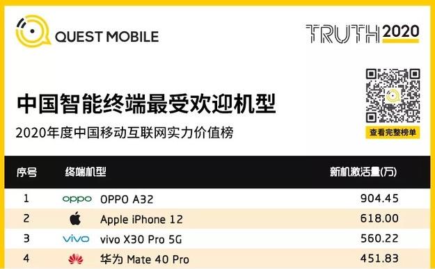 近日,Quest Mobile发布了《2020中国移动互联网年度大报告》,其中《中国智能终端最受欢迎机型》数据引发关注。其中在新机激活量方面,华为Mate40 Pro的激活量超过了450万台成为热议话题,机身总榜单的TOP 4成为热议话题,该机也一战封神。 华为Mate 40 Pro激活量超450万台 在已经过去的2020年,如果说华为的某款年度旗舰进入了年度销量TOP4,这在以前是很平常的事情。因为华为在过去无论是出货量还是品牌的影响力和认知度都是国内首屈一指的。而此番华为Mate40 Pro激活量超过了450万台,这个结果却来之不易。 众所周知,自2020年9月15日以后,来自美国的封禁全面生效,幸亏华为要求台积电提前赶工麒麟9000才能够让华为Mate 40系列顺畅发售。剩下的就不用我过多介绍了,因为供货量受限的原因至今还有人抢不到,华为Mate40 Pro能有如此成绩实属不易。 华为Mate 40 Pro基本可谓业界神话了 此外,华为Mate40 Pro的起售价格相对较高,主销256GB容量版本的售价早已超过7000元,跟iPhone 12基本持平。如果仅从激活量来看,价位越高的机型自然受众越小,但仍旧有这么多的用户在限量,预约,抢购的情况下选择支持华为Mate40 Pro,同样实属不易。 不知道未来华为的手机业务会走向何处,但不得不说华为Mate40系列是一个巅峰,也是一个奇迹,如今已成为业界的一个神话,未来更将是难以磨灭的传说。