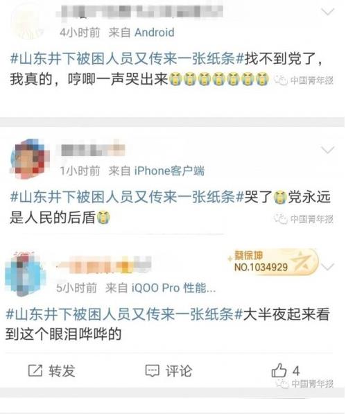 山东笏山金矿事故有新消息了:22名矿工被困井下,已发现12名矿工,其中五中段被困的11名矿工中,8人身体状况良好,2人有轻度不适,1人因在爆炸过程中受到冲击伤势危重,处于昏迷状态。此外,六中段的1名被困矿工也有伤情,具体情况尚不明确。通过已打通的3号钻孔(直径219毫米),井下被困人员又传递上来一张纸条,内容为“麻烦再送一部电话,做为备用。联系不到你们我们就找不到党了”。据现场救援人员介绍,由于需要通过钻孔向井下输送给养,电话线不能一直放在井筒里,以免缠绕。所以每次通话后,电话线要及时抽出。这张纸条就是在两次通话间隔时段,井下人员在接收给养后回递上来的。此前还曾出现过因电话机进水而通话失败的问题。接到纸条后,已向井下投放了多台防水备用电话机。如果电话机再遇到故障,井下人员可立即换上备用机。被困矿工体力有所恢复想喝的小米粥已安排此前,被困人员传来的纸条上写着:“望救援不停,我们就有希望,谢谢你了。”纸条上的每个字都牵动人心!一句“联系不到你们我们就找不到党了”更是令无数网友泪目:人民有信仰,民族有希望,国家有力量!
