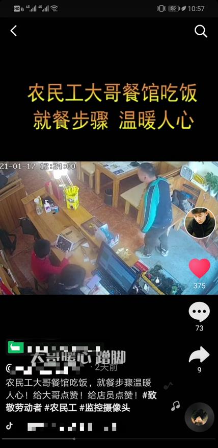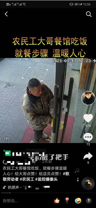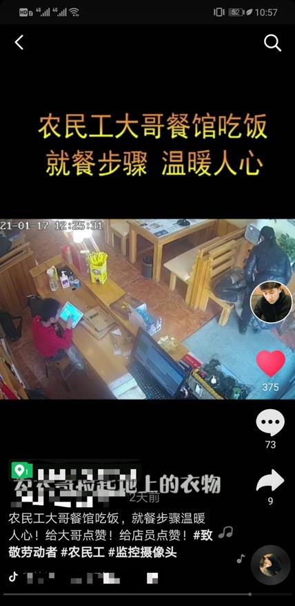 近日,社交平台上一条视频在引起热议并广泛传播,山东日照,一位农民工欲进餐馆就餐,进店前他摘下手套和帽子,生怕弄脏了门把手;进店后,他脱下脏兮兮的外套放在地上,反复在进门处的垫子上蹭掉脚上的泥土,随后并前往洗手间清洗,就餐之后餐桌一如既往地干净。这几个步骤,让老板娘很感动,她很快把农民工扔在地上的衣服捡起来,放在椅子上,这个举动也引来网友点赞。 1月20日,老板娘陈女士说,老公得知此事后,将视频发在网上,并说这位大哥再来就餐直接免单,陈女士说:“当时我光顾着感动去了,忘了当场给他们免单。” 1月20日,潇湘晨报记者联系上这家餐厅的老板娘陈女士,陈女士详细讲述了这件温暖小事的过程。 1月17日,有两位农民工大哥走进餐厅,刚进门,其中一位农民工一边用力蹭鞋子上的尘土,一边小声问她:“我可以把衣服放在这里吗?”农民工从工地回来,身上脏兮兮的,“他的眼神有些躲躲闪闪,还有些自卑。”陈女士说,“我当时就觉得有点儿心酸。” 陈女士告诉他可以把衣服放在椅子上,农民工却把衣服放在了地上,随后去了楼上,陈女士赶紧走过去,把地上的衣服捡起来。几分钟后,陈女士发现他们的手和鞋子被洗得干干净净。 陈女士说,农民工吃完饭后,桌子上干干净净,这让她再次感动了一把。 晚上,陈女士把这件事告诉老公,老公问他:“你给他免单了吗?”陈女士说:“我光顾着感动去了,忘了这件事。” 陈女士的丈夫将监控视频发布在社交平台上,并配上文字“农民工大哥餐馆吃饭,就餐步骤温暖人心!”陈女士的丈夫在视频最后表态:这位大哥再来就餐,直接免单! 陈女士说,事后这几天,有看到过这条视频的食客进店后,对她竖了一下大拇指,“我觉得特别温暖。”
