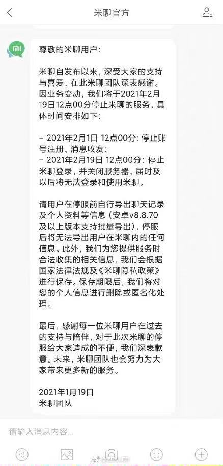 刚过十周岁“生日”的米聊宣布停服。小米集团旗下米聊宣布将于2021年2月19日12点00分停止服务,米聊公告显示,请用户在停服前自行导出聊天记录及个人资料等信息(安卓v8.8.70及以.上版本支持批量导出) ,停服后将无法导出用户在米聊内的任何信息。