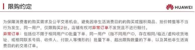 查询华为官网得知,华为开始管控用户收货地址,凡是同一地址、相似地址、同一电话和收货人的订单均会被系统拦截,并且客服无权限操作。 华为官方旗舰店客服透露,目前华为官方旗舰店内上架的商品均采取限购政策:“有的是一台,有的是两台,但都会严格执行。” 客服表示,为了保障消费者的购买需求及公平交易机会,避免因非生活消费目的的购买或囤积商品、抬价转售等不当行为发生,同一用户仅限购2台。有部分商品限购一台,且店铺有权对异常订单不发货且不进行赔付。 异常订单即包括不限于相同用户ID批量下单、同一用户存在相同或虚构收货地址等情况的交易订单。