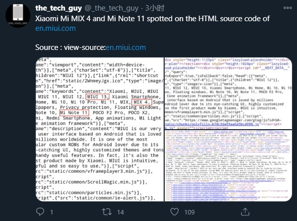 来自 XDA 论坛的一位成员 kacskrz 发现,小米 MIX 4、MIUI 13 和小米 Note 11 的名称已经出现在了小米官方网站 miui.com 的 HTML 代码中。 对于当前一波又一波后浪推翻前浪的手机市场来说,这并没有任何意义,但这意味着小米已经在研发甚至准备推出这两款机型,甚至将首发 MIUI 13。 目前关于小米 MIX4 和 MIUI13 的消息并不多,但大部分数码博主认为该机将在今年年内推出,同时而来的还有 小米 11 Ultra 以及小米 Fold 等。 去年有博主放出了宣称是小米 MIX4 的工程机真机图,显示小米正在开发屏下摄像头版本的机型,但之后再无消息。