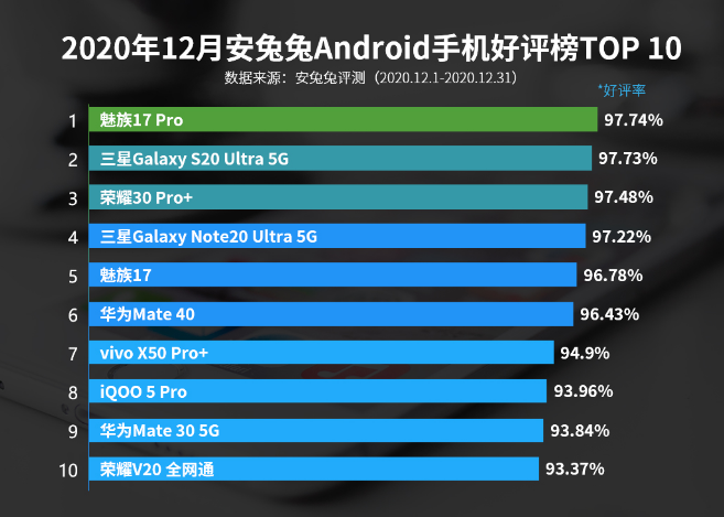 过去的2020年,智能手机行业有了哪些改变?最明显的莫过于屏幕和充电速度。在屏幕方面,刷新率得到了彻底升级,高刷在中端及千元机上也几乎成为标配。而在充电方面,有线充电一路提升到了120W,无线充电也来到了50W。另外,2020年的旗舰手机在拍照方面也迎来了新的突破。那么,在2020年发布的手机中你个人最喜欢哪一款呢?在回答这个问题之前,我们不妨先来看一下安兔兔最新的公布Android手机好评榜TOP 10榜单。 具体的排名情况如图所示,本次好评榜排名第一的机型是魅族17 Pro,该机自发布以来就长期活跃于好评榜,第一名也拿了很多次。17系列是魅族在2020年唯一的旗舰机型,该机目前的到手价已经来到了3899元,相比上市之初降价了400元。除此之外,同系列中的标准版魅族17本次也有入榜,排名第五。与之相同的是,魅族17的价格也下调了400元,当前到手价为3299元。不同的是,在功能性方面要弱于Pro版本,比如没有无线充电,没有长焦镜头。 排名第二的机型是三星Galaxy S20 Ultra,该机也是安兔兔好评榜的常客。作为20年Android手机的天花板,算是三星近几年来堆料最猛的一次,即使放到当下,它的配置依然很能打。而在价格方面,在Galaxy S21系列发布之前,该机也经过了大幅降价,目前在京东平台的到手价为8699元,降价了1300元。但是我个人觉得,如果你准备入手这款机型还可以再等等,毕竟S21系列就快发布了,预计那时还会再次降价。除了Galaxy S20系列,三星的另一款顶级旗舰也有入榜,即Galaxy Note20 Ultra,在本次榜单中排名第四。 随后的第三名是荣耀30 Pro+,同样也是一款长期活跃于好评榜的机型。对于这款机型,无论是外观,还是配置,都和华为P40 Pro非常相似。而对于荣耀品牌,虽然现已独立,但产品策略不会变,所以我们一起期待一下接下来要发布的新机荣耀V40系列吧。接着的第六名是华为Mate 40,是该系列中的标准版。相比上一代,华为Mate 40的变化非常大,首先是屏幕由直面屏变成了曲面屏。其次搭载的芯片也和Pro版区分开来,该机搭载的是麒麟9000E芯片,但是性能方面完全够用。而与Pro版相比,我觉得标准版的优势在于更易于接受的价格和更舒适的握持手感。 剩下的第七到第十名依次为vivo X50 Pro+、iQOO 5 Pro、华为Mate 30 5G以及荣耀V20。其中,前两款是20年的机型,vivo X50 Pro+是vivo X系列的转型之作,如今新款也快要来了,所以同样也是建议大家再等等。而后两款则是老机型,华为Mate 30发布于2019年,荣耀V20发布于2018年尾巴。 好了,以上便是安兔兔最新公布的Android手机好评榜TOP 10,也算是对2020年手机的一次简单总结。另外,根据相关消息显示,本月预计会有多款骁龙888新机发布,所以下次的榜单或许会发生非常明显的变化。