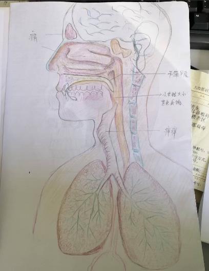 2020年12月18日,大连医科大学附属第一医院耳鼻喉科诊室,一名患者带着一张特殊的“片子”前来就诊,这是一张人体呼吸道器官解剖图的素描,他在不适的位置写明具体的感觉。医生看完忍不住感叹:症状描述简单准确,一目了然。首先引起其他患者的好奇。与患者通常携带的CT影像不同,这是一张自己画的“片子”,上面不仅有鼻、喉、气管、肺等部位,还有牙齿、骨骼,甚至大脑等“影像”,活脱脱一幅人体呼吸道器官解剖图。当患者递过来“片子”时,值班医生邢双春先是一怔,很快忍不住感叹“高手在民间”。这名患者在“片子”上圈注出不适的具体位置,并写明不适的具体感觉。“症状描述简单准确,一目了然。”邢双春说。 几乎不再需要更多的询问,医生很快给出诊断和治疗意见。