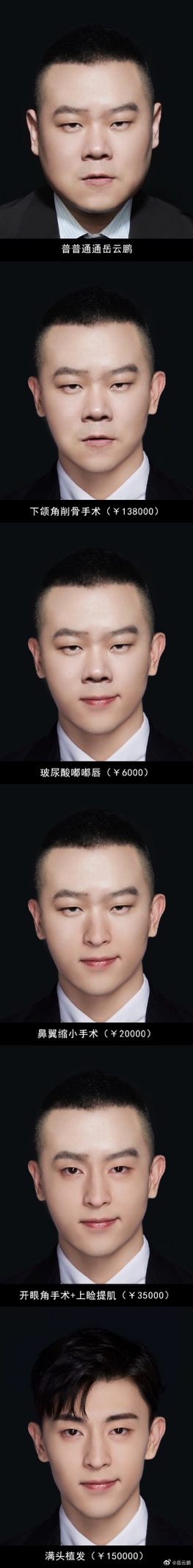 岳云鹏在社交平台上晒出把自己p成邓伦的过程图,并配文称:"花钱可以拯救吗?"引起网友热议。 从长图中可以看到,把岳云鹏变成邓伦一共需要五步,包括下颌角削骨手术、玻尿酸丰唇、鼻翼缩小、开眼角加上睑提肌和满头植发,真见证奇迹的时刻。 岳云鹏还贴心地在各种手术后贴上参考价格,算下来总共需要34万左右。