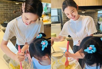 唐艺昕分享日常生活,带着3岁女儿一起做饼干,唐艺昕扎着两个小...