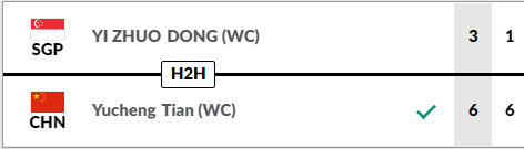 新加坡青少年冠军赛J30女单首轮比赛中,田亮女儿田雨橙6:3、6:1...