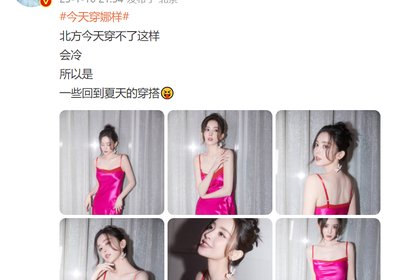 娜扎晒粉色丝绒吊带裙美照,配文“北方今天穿不了这样会冷,所以...
