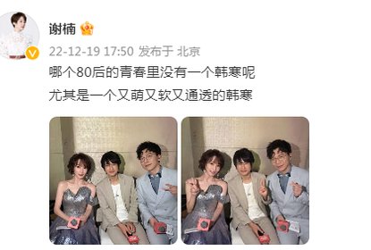谢楠在微博晒出与韩寒、陈铭在后台的合照,感慨道:“哪个80后的...