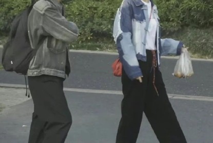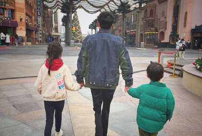 黄磊发博晒出带娃游环球影城背影照,图中黄磊把自己的腿p细了并...