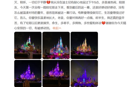 张歆艺分享一家三口共游迪士尼的照片。镜头中的袁弘头戴鸭舌帽侧...